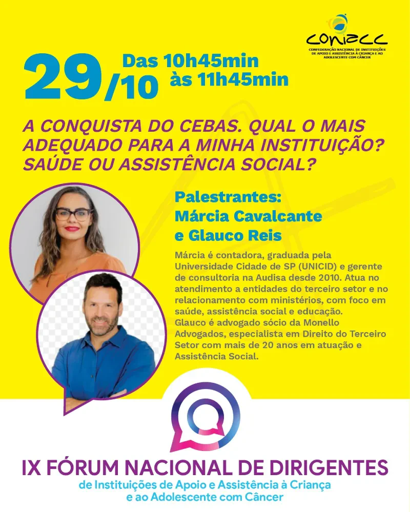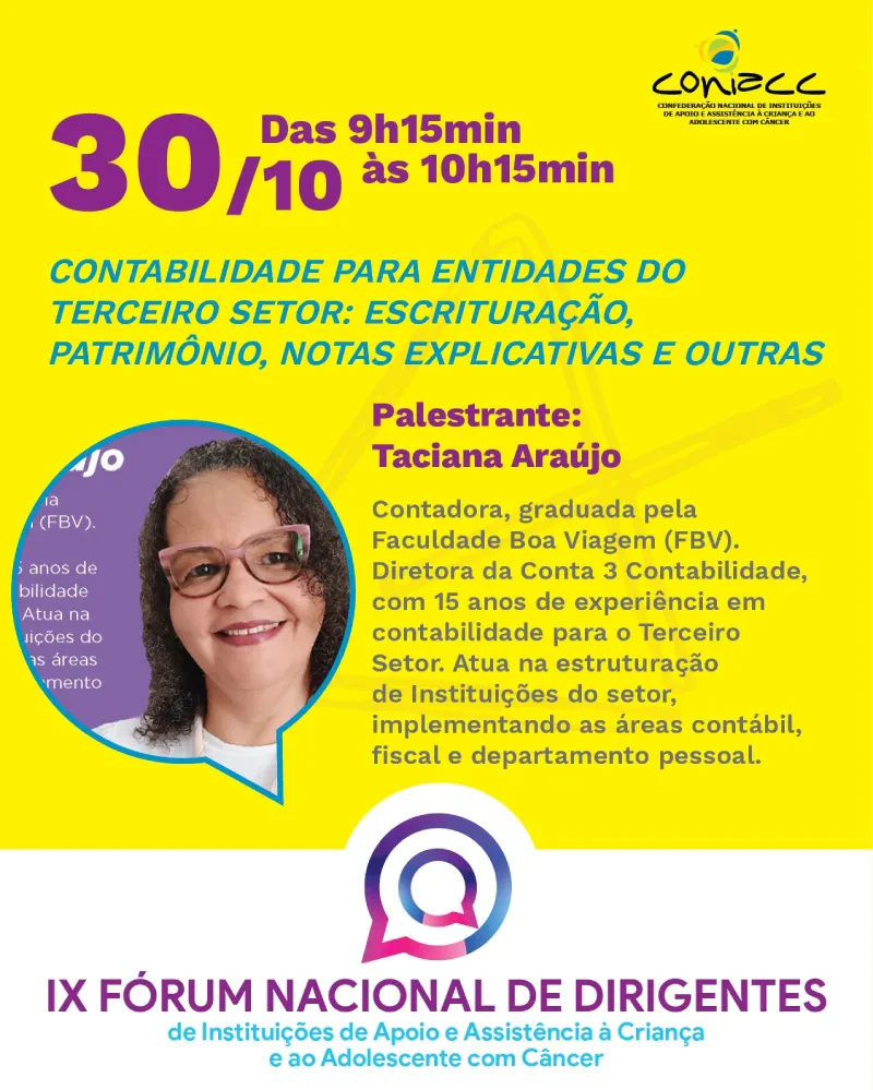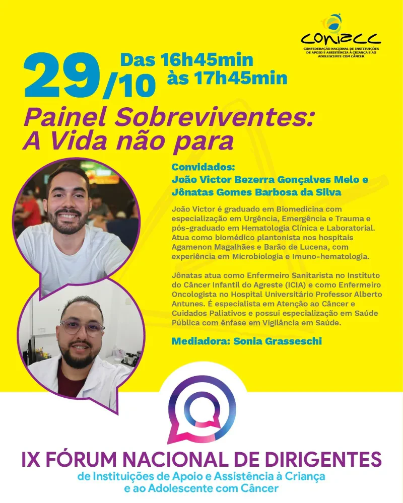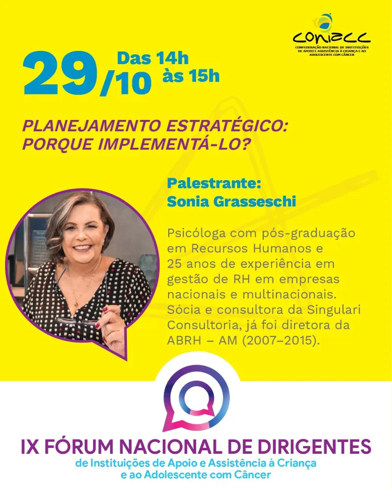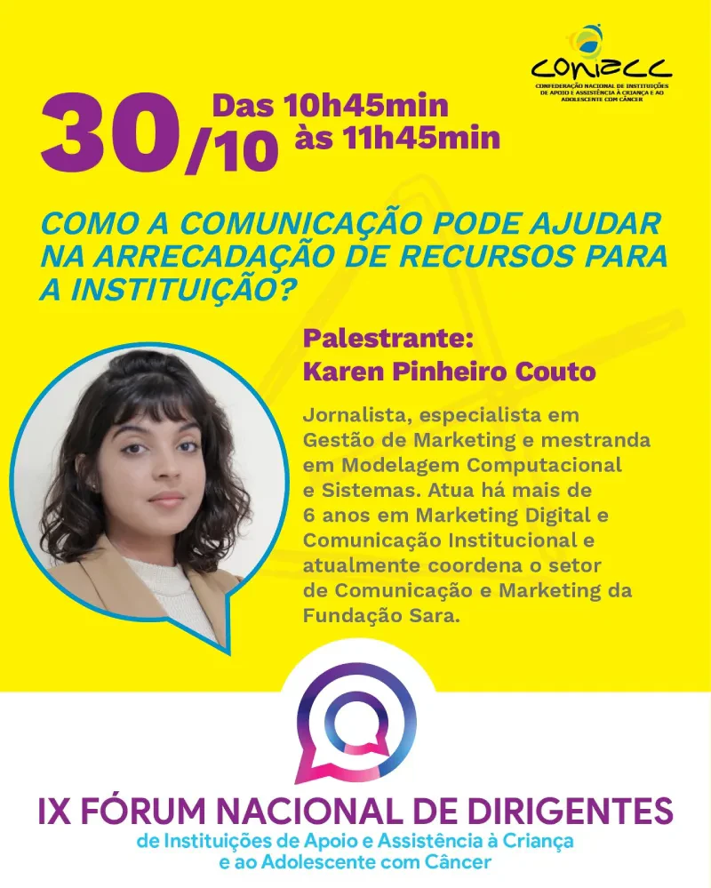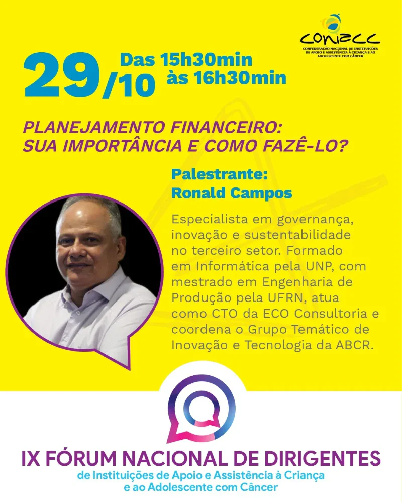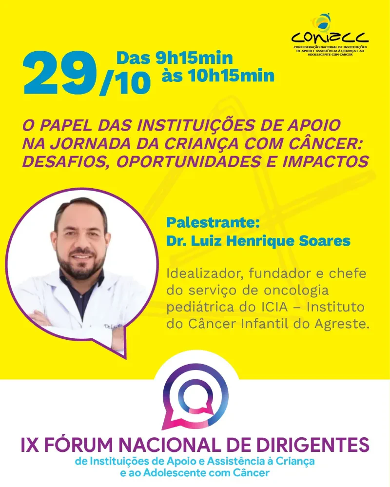 A CONIACC tem a alegria de anunciar a realização do IX Fórum Nacional de Dirigentes de Instituições de Apoio e Assistência à Criança e Adolescente com Câncer, que acontecerá nos dias 29, 30 e 31 de outubro de 2025, na cidade de Caruaru, Pernambuco.