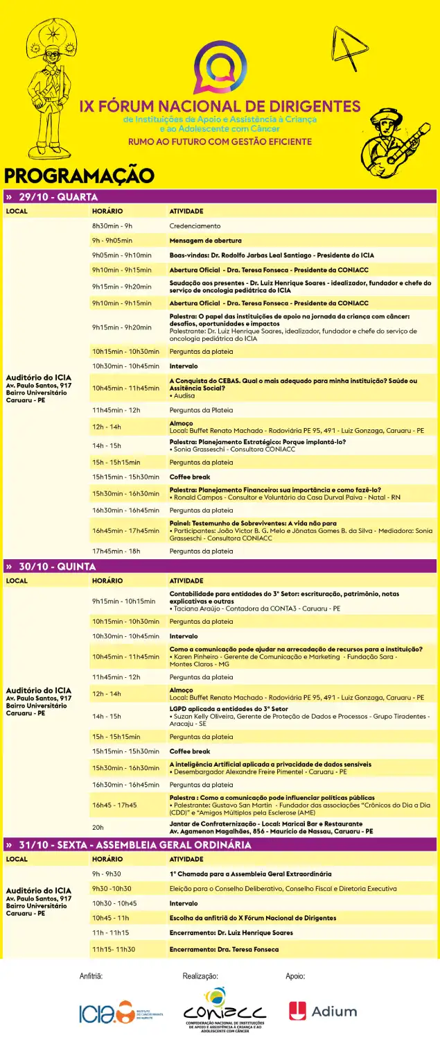 Neste contexto, a CONIACC realizara nos dias 29 e 30 de outubro/2025 o seu IX Fórum Nacional de Dirigentes de Instituições de Apoio à Criança e ao Adolescente com Câncer, na sede da associada anfitriã, Instituto do Câncer Infantil do Agreste, na cidade de Caruaru – PE.